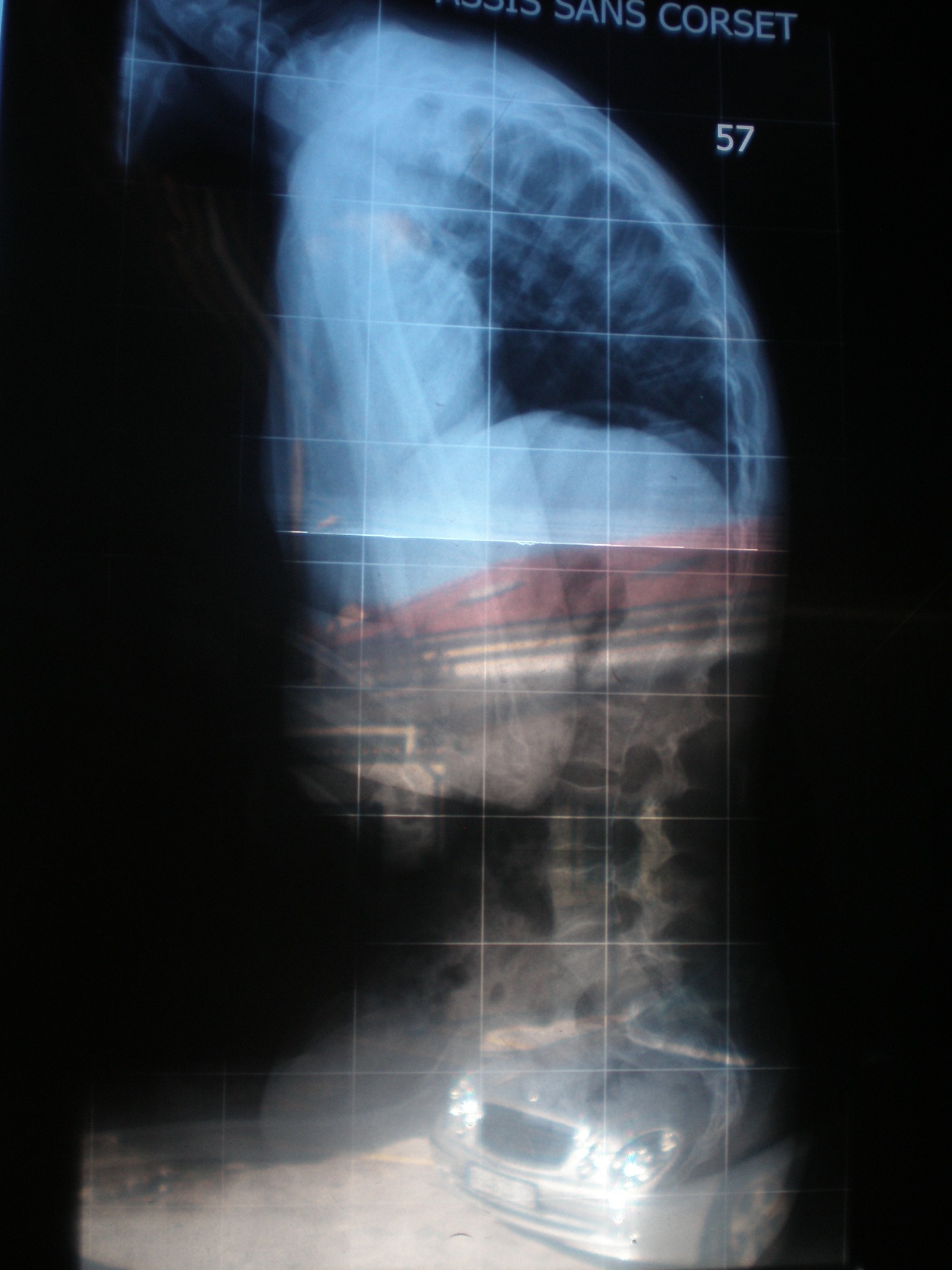 courbure de scoliose paralytique à l'origine, sustentation réalisée avec les appuis axillaires mentonnier et occipitaux réglables, l'appui pré-sternal ne restreint pas la capacité thoracique